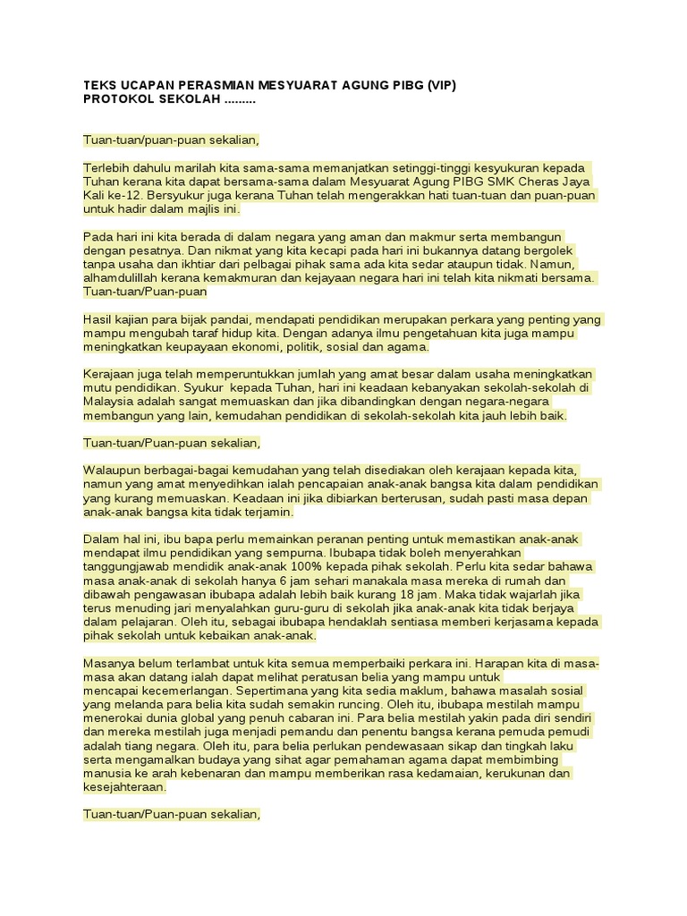 Teks Ucapan Ydp Pibg Sempena Mesyuarat Agung Pibg Smk Pernu Kali Ke Pdf